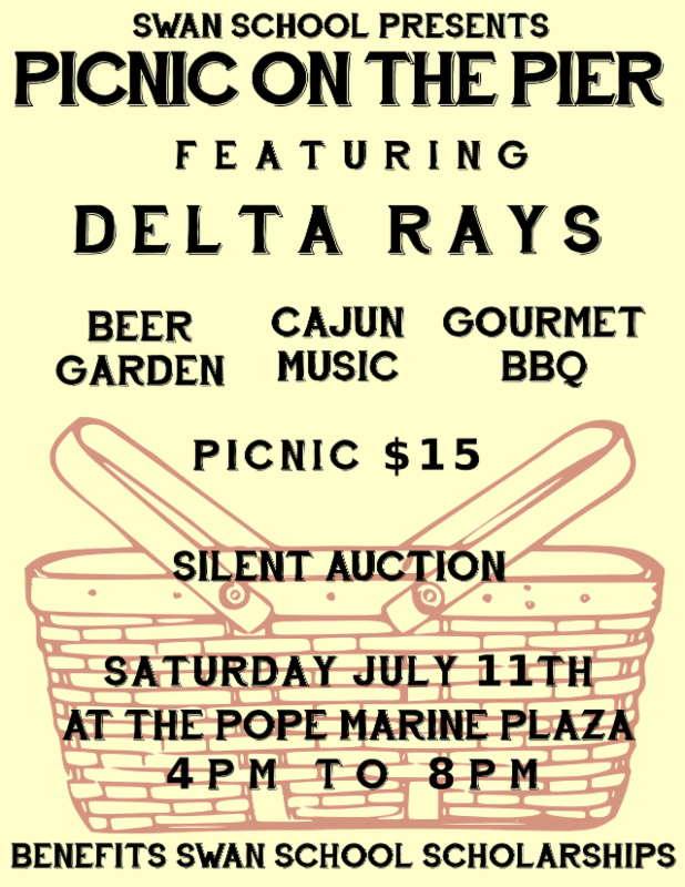 July 11, The Swan School presents "Picnic on the Pier" featuring Delta Rays. Cajun music, BBQ and scenic setting--proceeds benefit their scholarship program.
