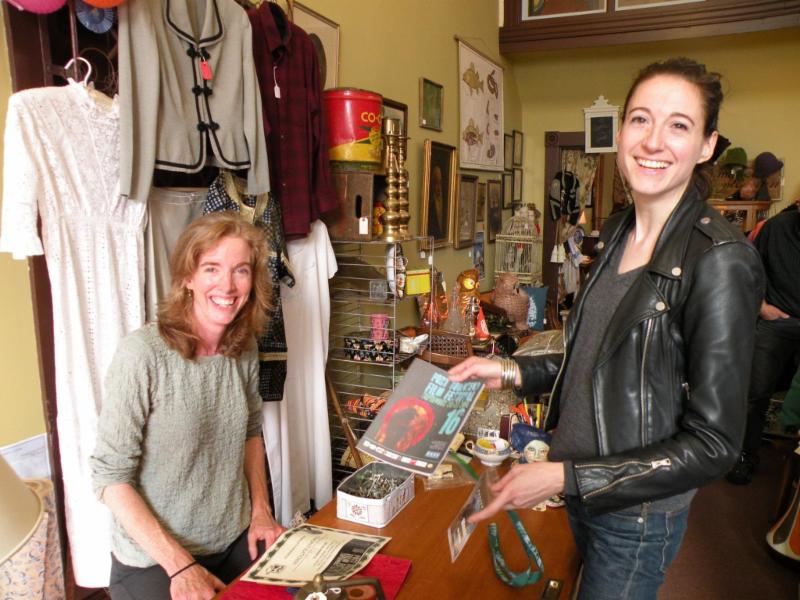 Congratulations to Magpie Alley, winner of the Main Street PT Film Festival window contest! The prize included movie passes and a certificate. This vintage pop-up shop in the Hastings Building features a wonderfully nostalgic window filled with memorabilia and light-hearted touches. Stop by to check it out. Thanks to our Promo team members and Renata Friedman, representing the Port Townsend Film Festival, for their help. Kudos!