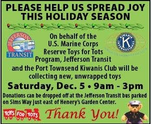 A Message from Kiwanis: The Port Townsend Kiwanis Club is sponsoring the 4th annual Port Townsend Marine Corps Toys for Tots program. This program is intended to ensure every underprivileged child in Jefferson County experiences a joyful holiday season. They are seeking NEW, unwrapped toys or cash; all donations remain in Jefferson County. Look for collection boxes and cash canisters at numerous businesses in Port Townsend, Port Hadlock, Chimacum, and Port Ludlow.
