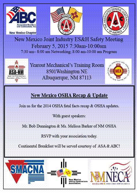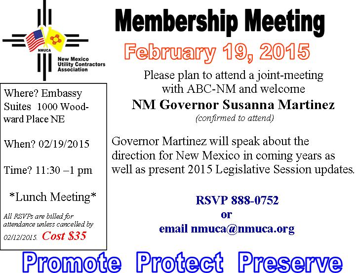 Our first membership meeting of the year is a joint meeting with ABC NM on February 19, 2015 and our guest speaker is Governor Susana Martinez. Please plan to attend and find out plans for NM's future and how the 2015 Legislative Session is going with the new make-up of its members splitting the majority to a Republican House and Democrat Senate. RSVP by calling 505 888 0752 or email Jane at nmuca@nmuca.org