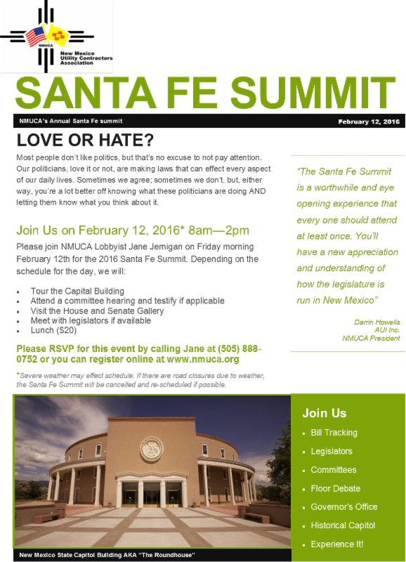 The New Mexico Legislative Session starts on February 19, 2016 and I am honored to be your lobbyist and represent you. This is a short session of only 30 days, but there is a lot of work to be done and quite a few bills that we will be working on regarding Worker's Compensation, Capital Outlay (changing the process), Preemptive Local Employer Mandates, Prevailing Wages, Infrastructure Funding and other business issues. Please help me be a more effective lobbyist for you and our industry by providing feedback, responding to legislative alerts, and letting me know what's important to you! I will be sending out weekly updates so that you'll be informed along the way. Also, consider joining me at the Santa Fe Summit on February 12. (details below)