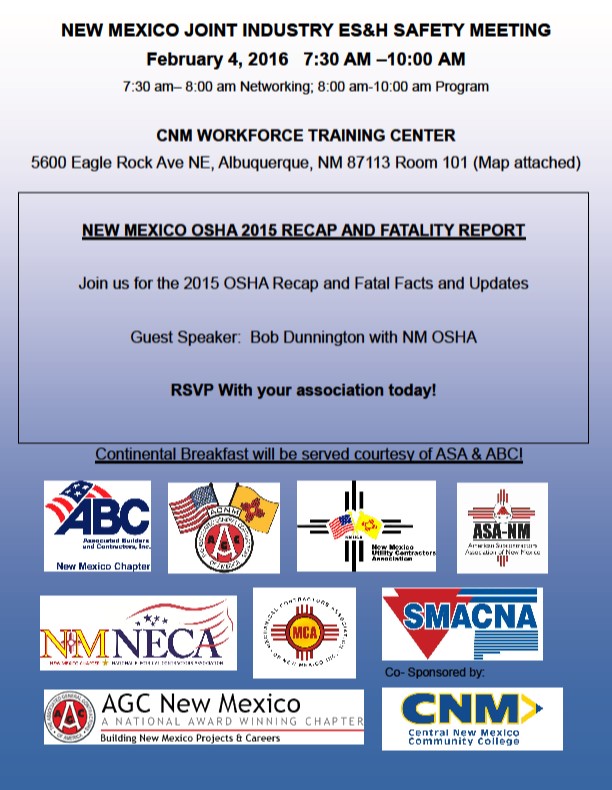Our first membership meeting of the year is a joint meeting with ABC NM on February 25, 2016 and our guest speaker is Don Tripp Please plan to attend and get a summary of the 2016 NM Legislature.