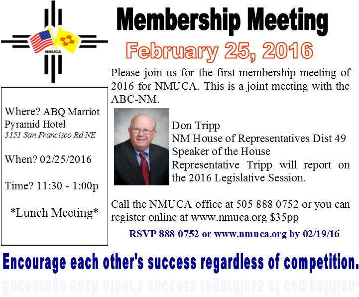 Our first membership meeting of the year is a joint meeting with ABC NM on February 25, 2016 and our guest speaker is Don Tripp Please plan to attend and get a summary of the 2016 NM Legislature.