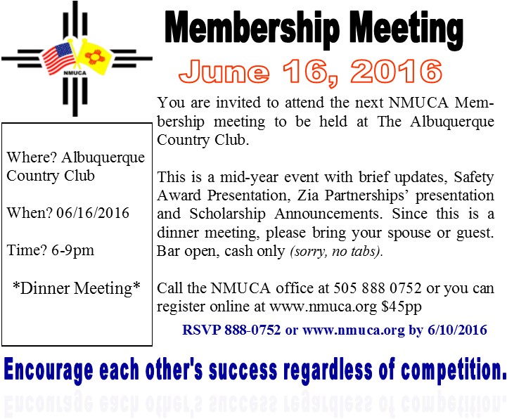 As summer approaches, everyone seems to get busy and that's no exception for NMUCA. We have lots of events and training coming up and I hope that you have time to join us! Thanks to everyone who attended our last membership meeting with Ron Peterson, Baker-Peterson LLC. It was a great turnout and a very informative presentation. Our next membership meeting is scheduled for June 16th as the Mid-Year-Social will takes place for dinner from 6pm to 9pm at the Albuquerque Country Club. This meeting is a bit different from our regular membership meetings as it's less business and more social and networking. Also, we love to see you bring your spouse, significant other or guest since we'll enjoy dinner and drinks. I hope to see you all there. Plus, we have our annual NMUCA night at Isotopes Park which is always a great crowd and a great time; register early as we always sell out this event. (Details for meetings and training are below in this newsletter with links to register online)