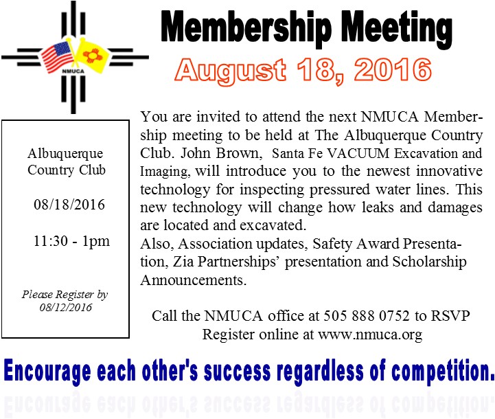 Welcome to August! It seems that once the new school year starts, the rest of the year just flies by. I hope you have some time to participate in our upcoming meetings and golf tournament. Our next membership meeting is in August and John Brown, Santa Fe Vacuum Excavation and Imaging, will be demonstrating some new technology to our industry on how pressurized water lines can be inspected. We'll also present the Safety Awards, Zia Partnerships and announce scholarship recipients. You can register by clicking on the link below in the newsletter.
