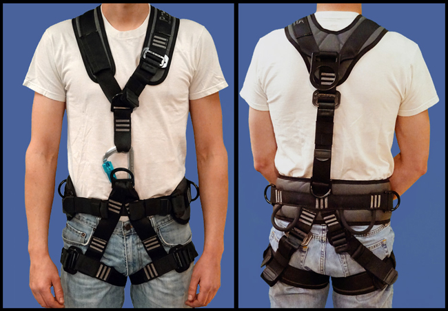 The Rope Access harness features 6 D-ring attachment locations including the preferred dorsal fall arrest point on the upper back, two hip rings, a waist ring a lumbar ring, and a sternum ring. Two convenience loops at the hips keep tools in easy reach. It comes in sizes from XS to XL to fit waists from 28" to 52". The list price for the harness is $330.00 It is available in any color you want as long as that color is black.