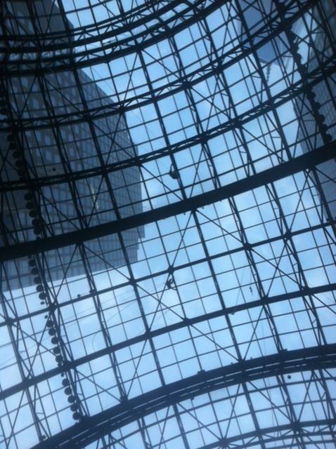 The two riggers, Paul Sapsis and Garth Shack, are in the roof steel of the Winter Garden, which is an event space in the World Financial Center located in lower Manhattan across the street from the World Trade Center. The Winter Garden, which gets it's name from the nine 60' tall palm trees that grow inside, is a 120' tall glass domed building.