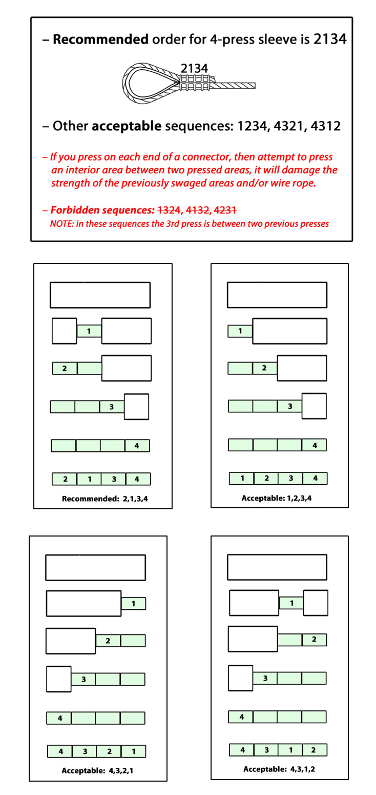 The simple description of swaging order is that you want to either crimp from one end of the sleeve to the other or start in the middle and work out so the sleeve material is pressed smoothly. You do NOT want to crimp in an order where you create a "bubble" between two crimps.