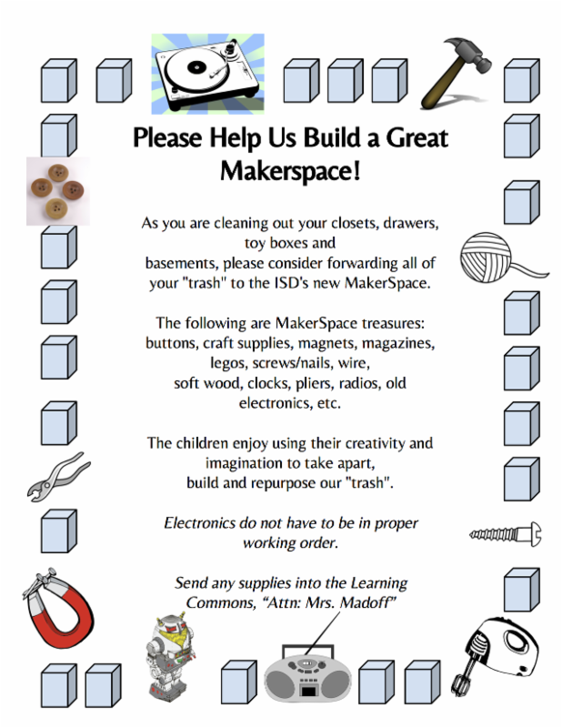 We are also looking for Lego pieces, old electronics, and tools to add to our Makerspace. Please see the flyer below for more information.