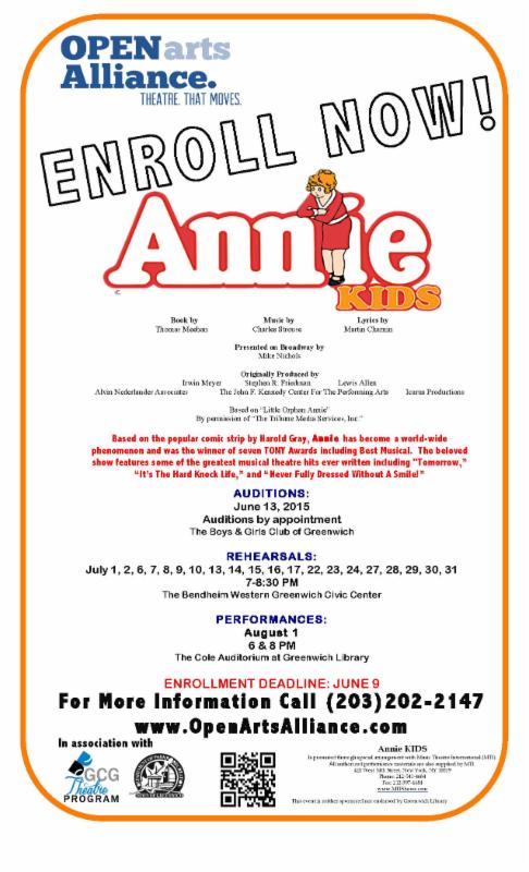 In collaboration with the Department of Parks and Recreations and The Boys & Girls Club Theatre Program, Open Arts will be producing a summer musical theater workshop that culminates in a performance of the musical ANNIE, for students ages 6-18. See flyer for more information.