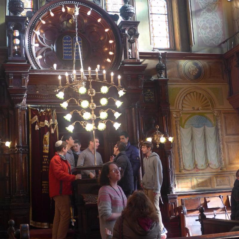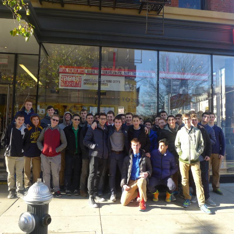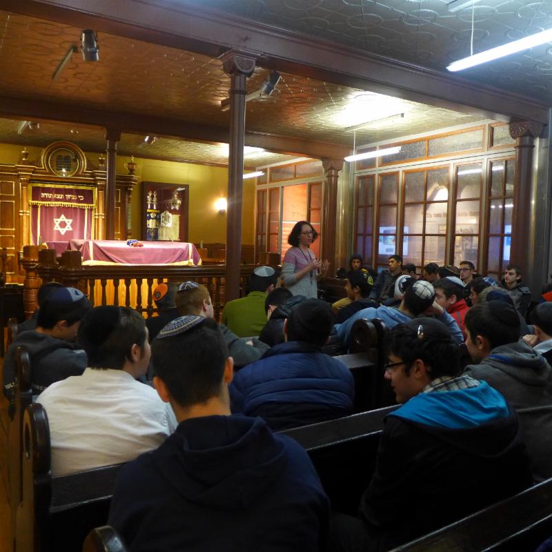 On Tuesday, the entire eleventh grade stepped back in time to the world of their ancestors as they visited and toured New York's Lower East Side. The immigrant experience in the United States in the late 19th and early 20th centuries is one of the topics which is covered during the first semester of 11th grade American History classes. The first stop was the Lower East Side Tenement Museum, where students were divided into four groups alternating between two separate tours, both of which recreated the immigrant experience on Orchard Street at the turn of the 20th century. Actually stepping into the restored tenements to see the conditions in which new immigrants worked and lived was quite an eye-opening experience for many of the students. Docents shared primary sources and artifacts with students as part of their tour and each group concluded with a discussion activity. Next stop was a tour of the magnificent Eldridge Street Synagogue. The students were briefed on the rich history of this landmark synagogue, built entirely by the Jewish immigrant population, and the role it played within the Lower East Side community at the time. Their "immigrant experience" concluded with students having the unique experience of davening mincha there. Many thanks to our chaperones - Ms. Hoenig, Dr. Master, Mrs. Moskovits and Mrs. Reichardt.
