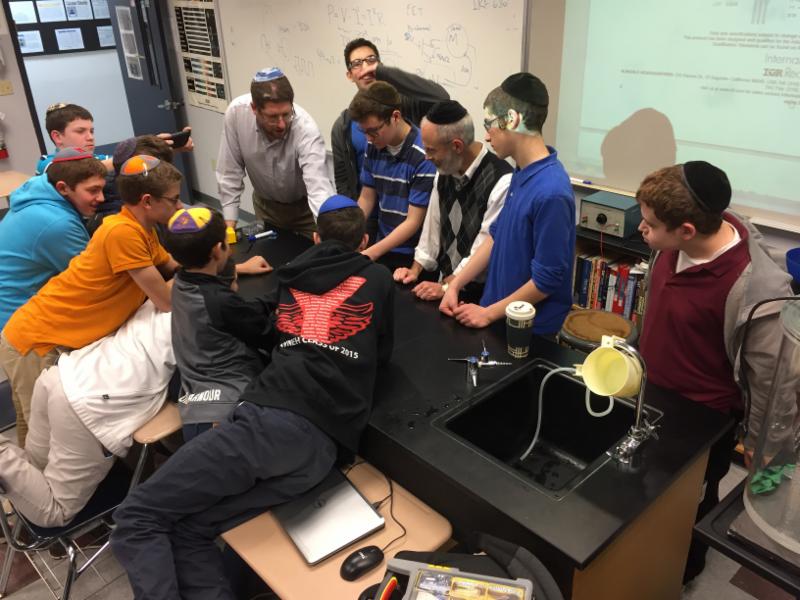 Dr. Berman's 9th grade engineering class is learning the theory and practical applications of transistors. Dr. Dov Kruger is demonstrating the underlying circuitry. Here, the transistor is used as a fast switch.
