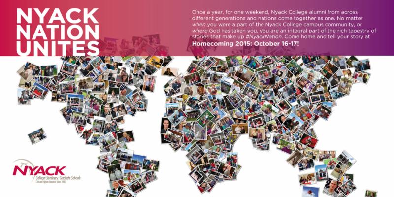 For the complete schedule and to register online, visit www.nyack.edu/homecoming. For questions or additional information, please contact Erica Videc in the Alumni Office at 845-675-4426 or by email to Erica.Videc@nyack.edu. And keep the conversation going on Twitter and Facebook using #NyackHomecoming and #NyackNation. Hope to see you in October!
