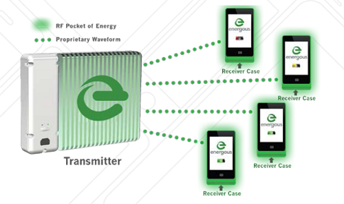 Energous has made a wireless charging system named "WattUp" which has a charging radius of 15 feet. The transmitter will be just about the size of a wireless router. Instead of magnetic induction, radio frequencies will be used to charge the devices.