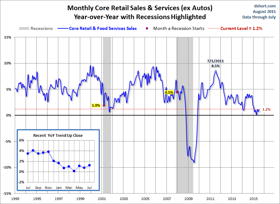 Maybe analysts expect production of goods to pick-up significantly from here. Unfortunately, the Institute for Supply Management's (ISM) manufacturing index at 51.1 is barely above the 50 level which is the demarcation between expansion and contraction. And, consumer sales, excluding the current bubble in new car sales (loans), shows we are below the point that designated the start of the prior two recessions (graph also per Doug Short):