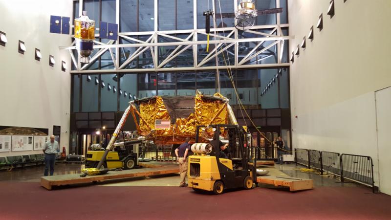 The Apollo Lunar Module #2 (LM) has been moved in two pieces to the Boeing Milestones of Flight Hall, its future home. Here the ascent stage is lifted off the descent stage as the first step in the move. The LM will receive conservation treatment and then be fully reassembled in early 2016. Learn more in this press release.