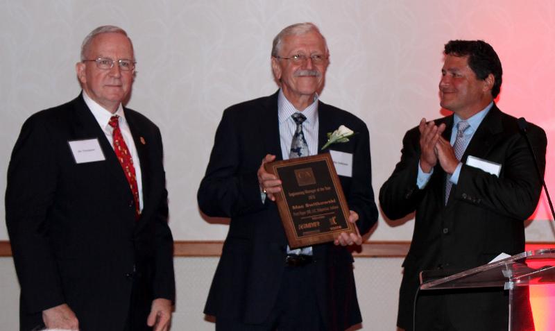 Mac Switkowski, center, holds his Capital Arguments Engineering Manager of the Year Award that was presented by Paperitalo CEO Jim Thompson, left, as Luis Henao, right, vice president at Pratt Industries applauds. Mac brought the new mill at Valparaiso in on time and on budget despite a change of paper machine suppliers mid project.
