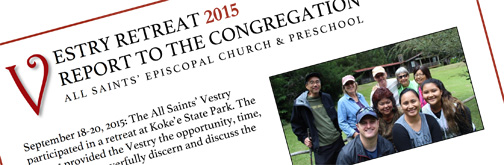 A few weeks ago, the Vestry participated in a retreat at Koke'e State Park, providing the opportunity, time, and space to prayerfully discern and discuss the future of All Saints'. A report has been compiled about the different ministries, activities and programs that were discussed, and will be explored and implemented over the next 16 months. Members are invited to join in the conversation and share your thoughts with the Vestry. Copies of the report have been mailed out to members and are also available to download HERE. Copies are also available in the Church and Church office. |