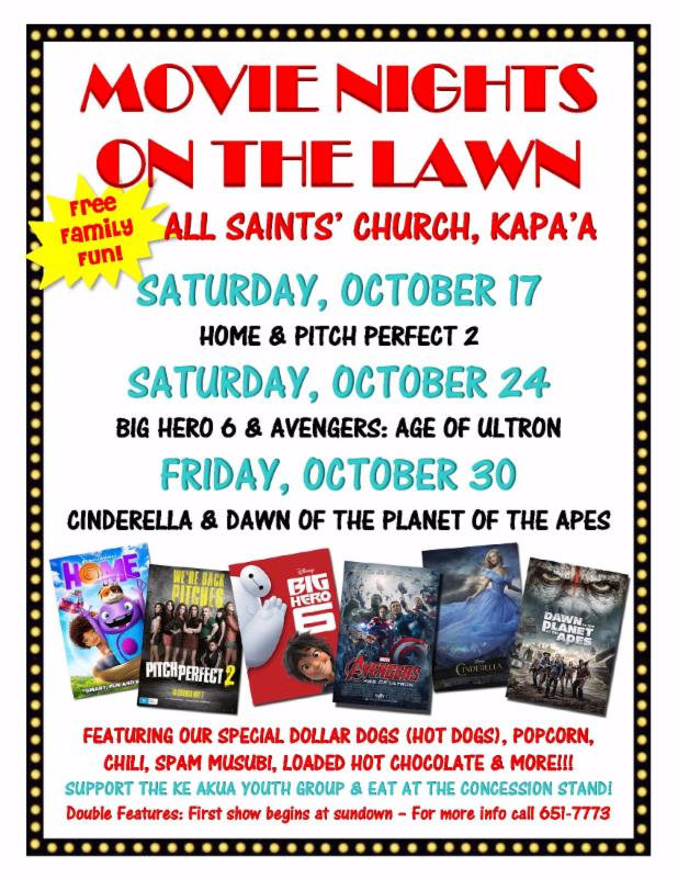 Mark your calendars and get ready for a month of movies on the lawn! Now in its 7th year, Movie Nights on the Lawn continues to serve the community by offering free double-feature movies and a concession that can feed a family of 4 for under $10! Yup! Dollar dogs, 50 cent popcorn, chili, SPAM musubi and loaded hot chocolate are just some of the ono grinds being served up by the Ke Akua Youth Group. The movies are a little late this year due to vendor availability, but great movies are in store! Click on the flyer to view the full-size version, and visit the webpage HERE for more info.