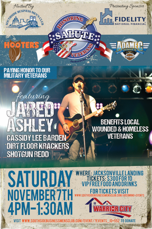 First, there will be a motorcycle ride sponsored by Adamec Harley-Davidson starting at their Baymeadows store to the event at the Landing ($25 per bike). Hooters will house the V.I.P. area with All-You-Can-Eat food and beverages. Warrior City secured Nashville recording artist (and Navy veteran) Jared Ashley to be the headlining artist! SBMC's own Dirt Floor Krackers will also be playing on the Landing stage at 5pm.
