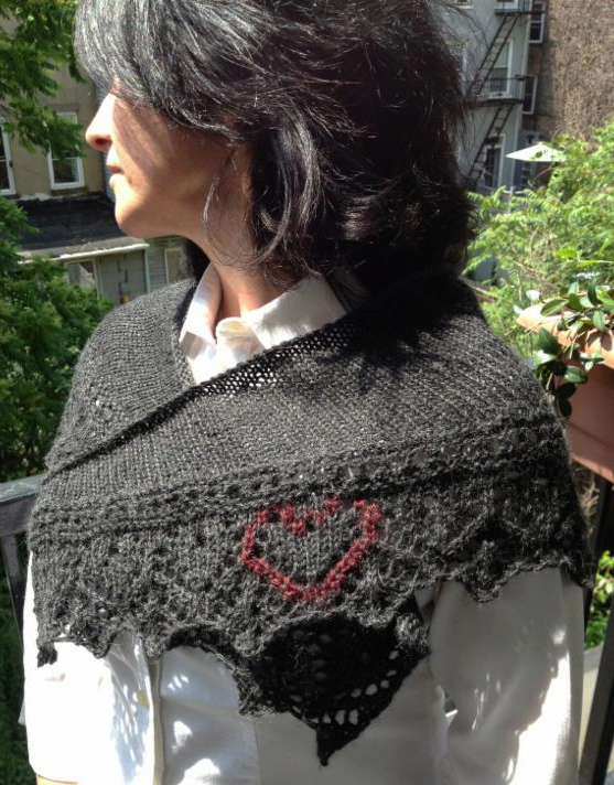 This shawl features a heart-motif border that can be accented with duplicate stitching in a contrast color. The pattern will be available this summer (if you would like to receive a free copy when it's released, click here.)
