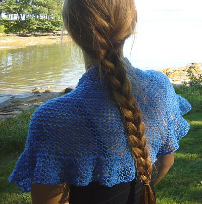Only using the knit stitch and yarn-overs, this shawl can be made to any size, with or without a ruffle. Wear it draped over your shoulders like a small shawl or wrapped around your neck like a scarf.