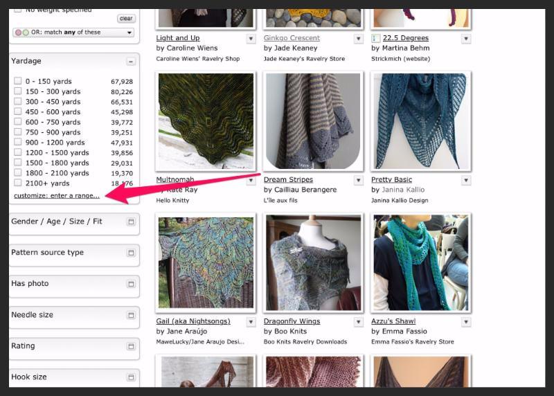 And because you only have one skein of 400 yds, select the Yardage filter and at the bottom of that box, select Customize: Enter a range: