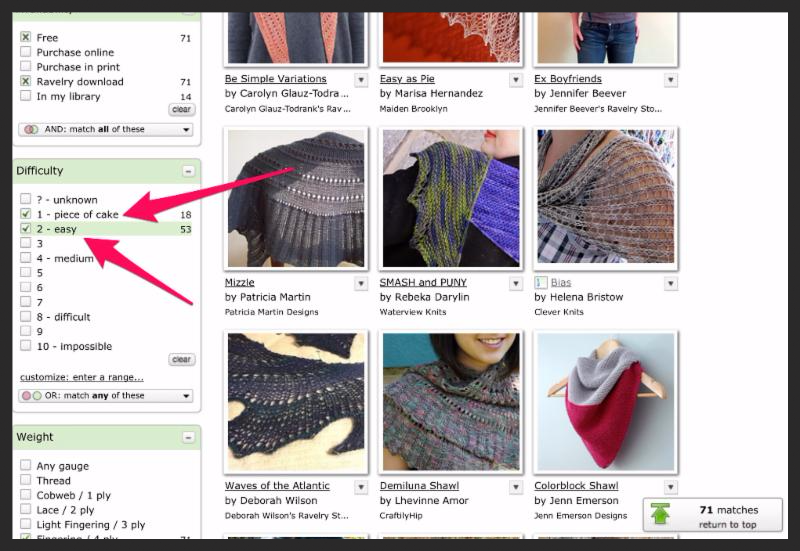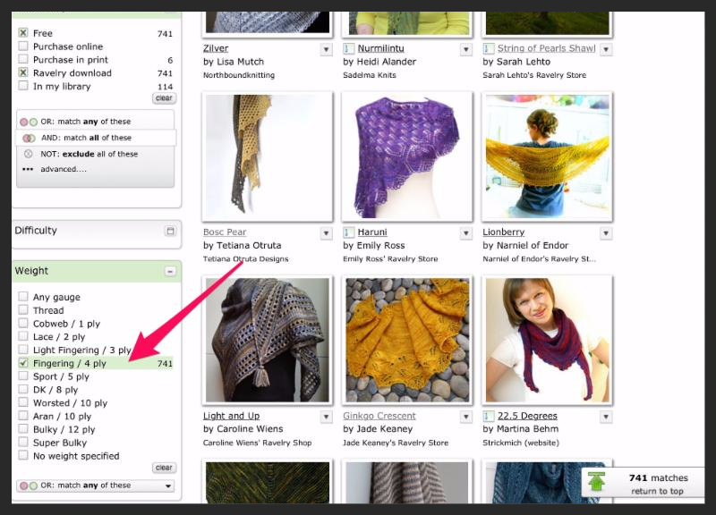 Let's say you had 400 yds of fingering weight yarn that you wanted to use to make an easy knit shawl. You want to find a free pattern that you can download from Ravelry so you could get started right away.