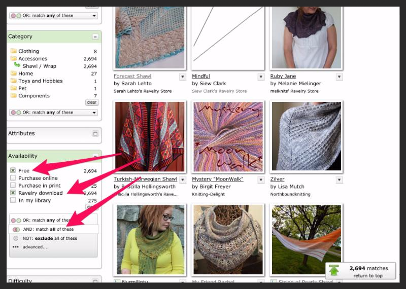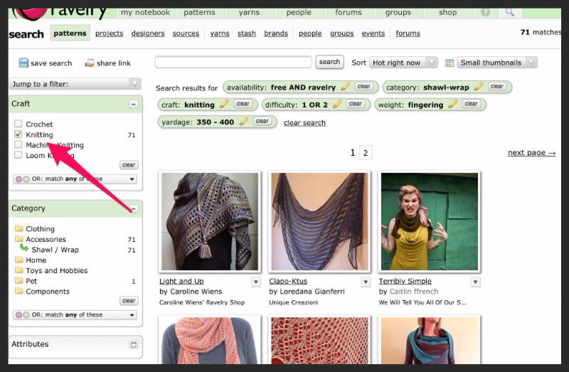Now you know how to search for a pattern with a few of Ravelry's different filters! There are many more filters you can use (try Attributes/Fabric Characteristics to search for cables or lace) so click away to see what you get!