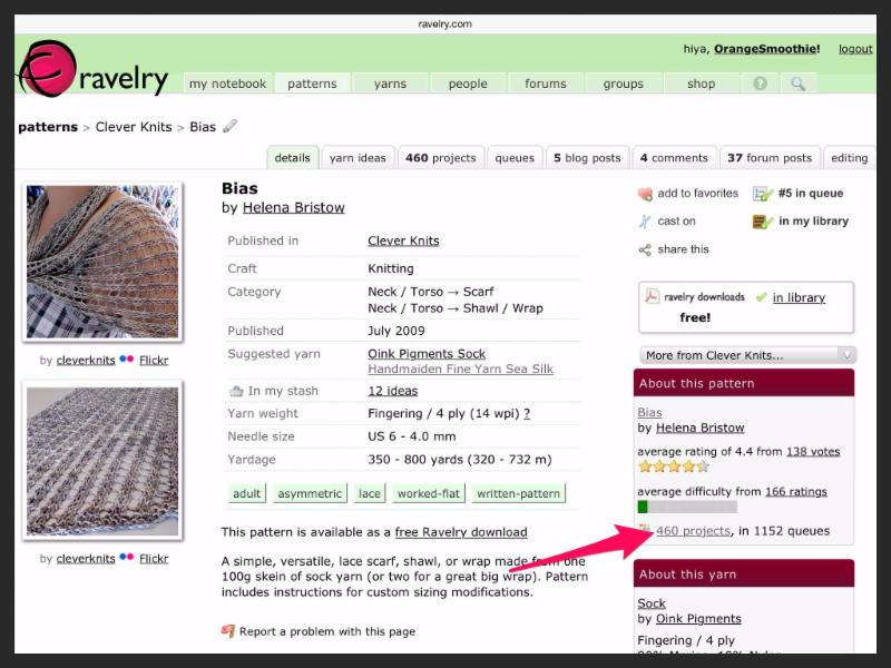 On the right side of the screen, you'll see the number of projects listed. If you click on that link, you can see other Ravelers' ratings and their project pages with their notes and photos.
