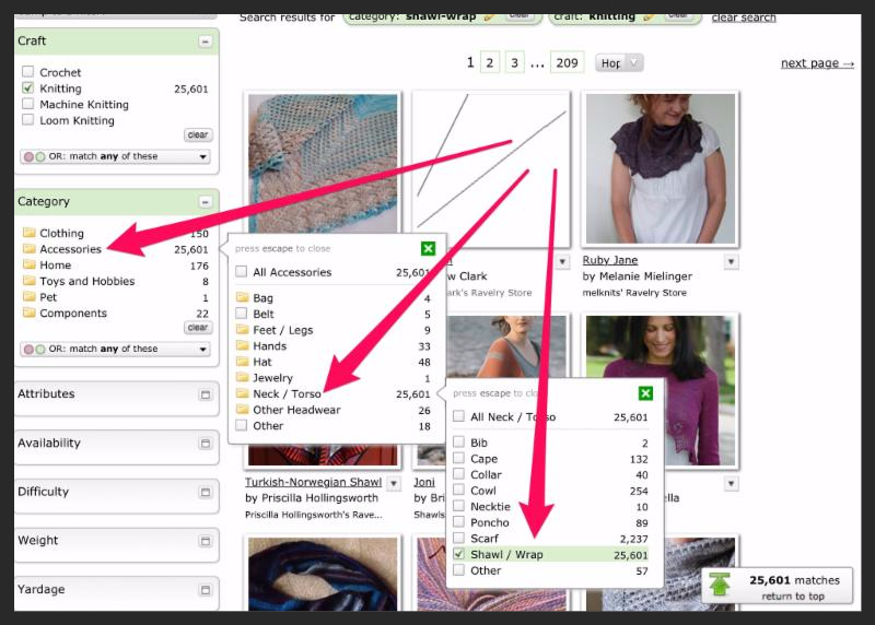 All the patterns in Ravelry that are tagged as knitting patterns are now displayed! To narrow this down to make a shawl, choose the filter, Category, then choose Accessories, then Neck / Torso, then Shawl / Wrap (you will need to click on the green X boxes to close those last two filters so you can see your results):