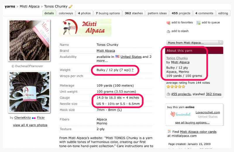 Another way to look at this same information is to see that her yarn suggests using bigger needles (US 11) than the pattern yarn (US 9-10 1/2) suggests.
