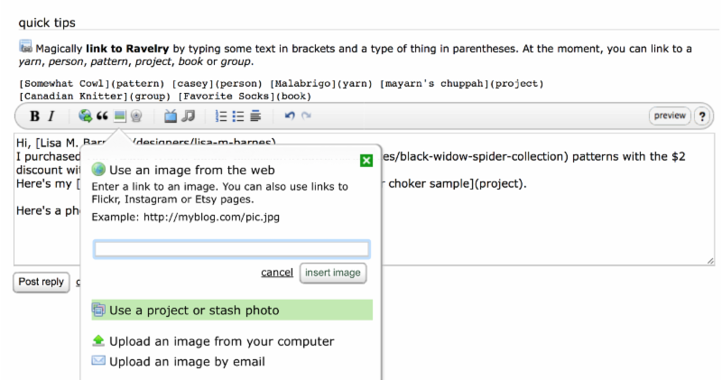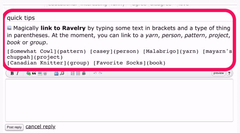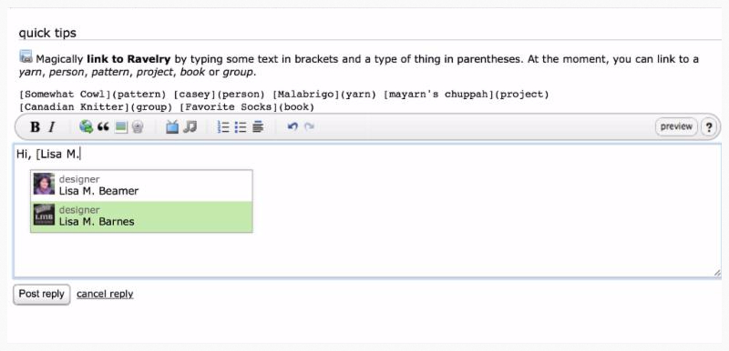 By referring to the quick tips, you see that you'll need to start by typing a square left bracket (like this [), then the person's Ravelry name, then a right square bracket, then (person) . You'll notice that Ravelry will suggest some other names for you that will save you having to type it all out! If you see the person you want, just click on that suggested link and Ravelry will add the code to your post.
