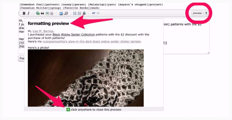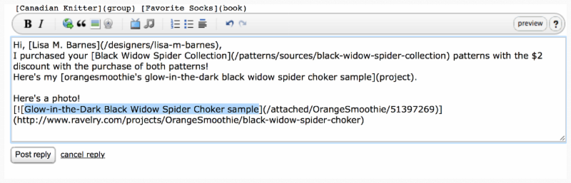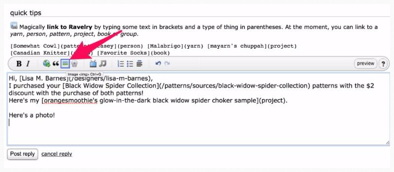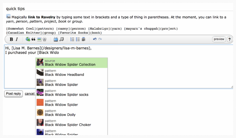 Linking to Patterns The same method works for adding a pattern link to your post. Just start with the bracket and type the pattern name. Ravelry will suggest the names of patterns from which you can select. Click on the one you want to add to your post.