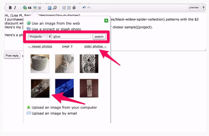 Adding a Photo From Your Project To add a photo to your project, click on the photo icon: You can select from the drop down to use a project or stash photo, or upload image from your computer or by email. Also, if you know the project name of the photo, you can include it in the search box. Scroll through newer or older photos until you see the photo you want to add to the post. When it's found, just click on it.