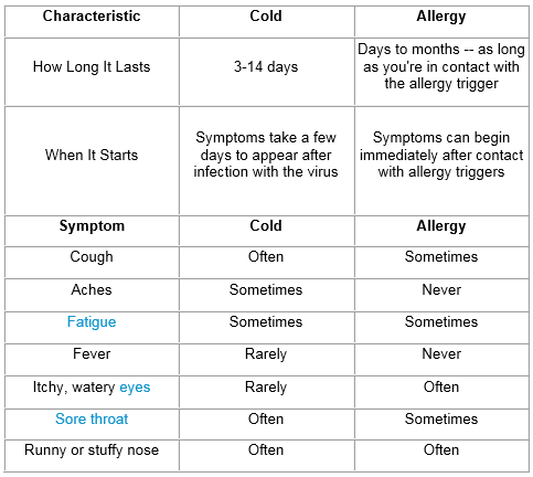 The most important difference is that colds usually don't last longer than 14 days. So see your doctor if you still have symptoms after 2 weeks. These may be allergy symptoms or signs of another problem.