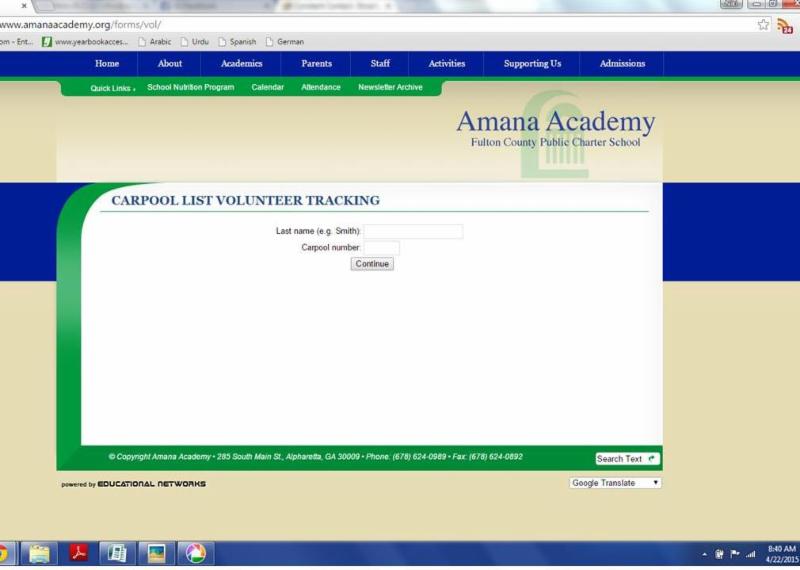 3. Enter your child's last name (not yours) and your carpool number (if your carpool number is a single digit - like "1", but it shows as "001" on your carpool tag, just enter the single digit in the Carpool number field):