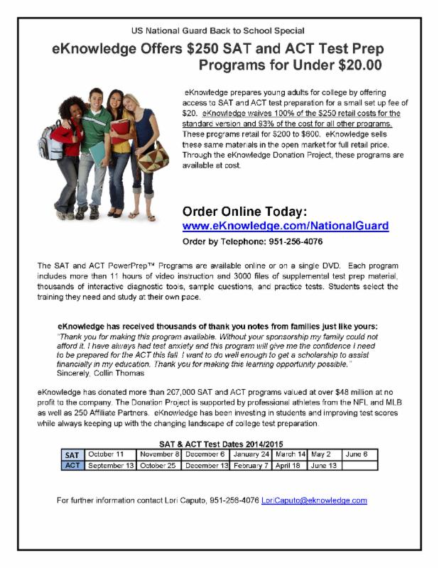 eKnowledge is once again offering their SAT and ACT Test Prep Programs for Free or at a steep discount! Each program includes more than 11 hours of video instruction and 3000 files of supplemental test prep material, thousands of interactive tools, sample questions and practice tests. Check out the flier for more information!