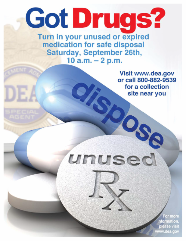 The 10th National Prescription Drug Take-Back will take place September 26th from 10 a.m. -2 p.m. Sites will be set up throughout communities nationwide so local residents can return their unwanted, unneeded, or expired prescription drugs for safe disposal. Collection sites can be found by going to www.dea.gov (after Sept. 1). This site will be continuously updated with new take-back locations.