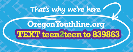 YouthLine is a free and confidential 24-hour teen-to-teen crisis, counseling and referral line for youth. It began in 1999 in response to the alarming statistics on youth alcohol and drug use and related teen issues and has since expanded to answer call about any issue affecting teens. Teen volunteers are available to help seven days a week from 4-10 PM, and the phone line is open 24/7 with adults answering when teens are not there. They can be reached by calling 1-877-YOUTH-911 (1-877-968-8491), by texting teen2teen to 839863 or through their online chat at oregonyouthline.org. Volunteers in the program have taken calls from all over the world as part of this program and helped with a huge variety of issues.