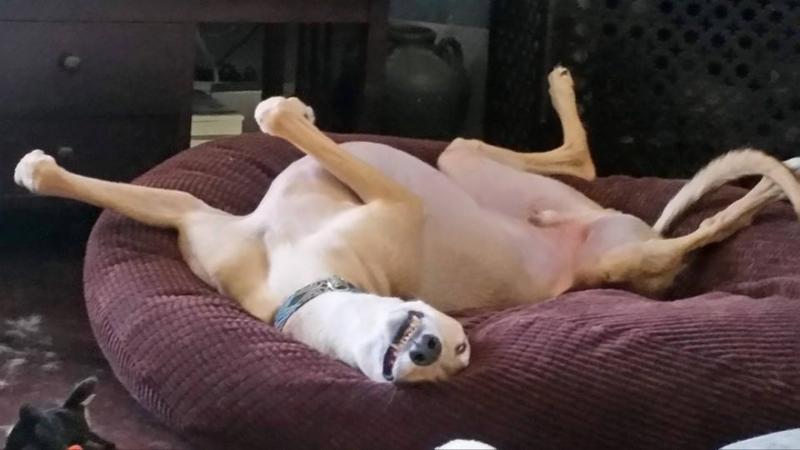 Bed Fail - No one has ever made a bed big enough for a greyhound. Invariably, part of the greyhound, and it's usually the head, ends up hanging off on the floor. Sometimes a greyhound fails to hit the bed entirely and lays on the hard floor next to the soft spot. We call this "bed fail."