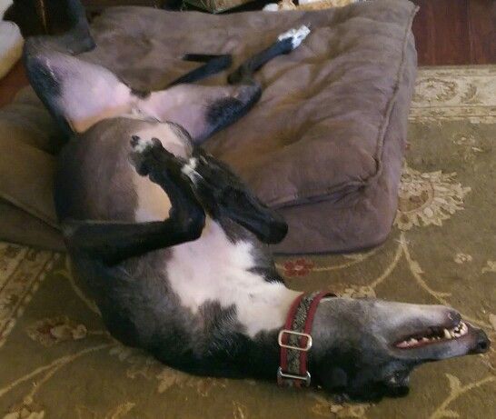 Roaching - Greyhounds love to flip on their backs with their legs in the air when they sleep. It's called roaching because it resembles the position of a deceased cockroach. "Advanced roaching" might include a one legged salute, cocked head, and can be combined with derp, ETS and a bed fail .