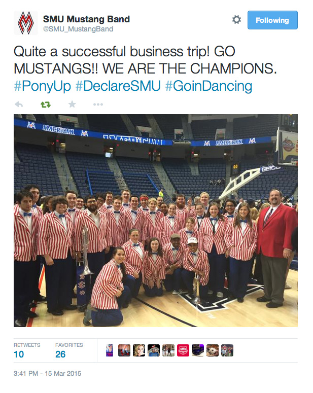 SMU's record made it a virtually NCAA lock going into the AAC tournament last week, but Sunday's win sealed the deal. And, of course, the Mustang Band was there. Viewers at home could hear a number of Mustang Band classics coming through loud and clear on the ESPN broadcast, from "Pony Battle Cry" to the "Blue Brothers Theme."