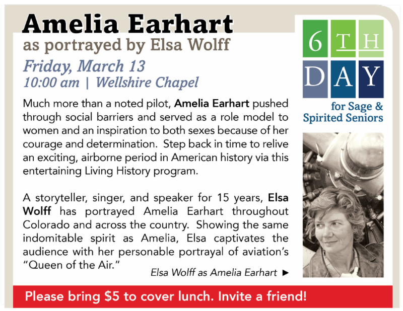 | MAR 13 | 6th Day: Amelia Earhart; The Denver Brass Celtic Fantasy | | MAR 15 | Church-wide Dinner and Talent Show for Youth | | MAR 20-22 | NEXT Young Adult Retreat in Breckenridge | | MAR 29 | Passion/Palm Sunday; Deacons' Pancake Breakfast | | APR 2 | Maundy Thursday @ 7:30 pm in the Chapel | | APR 3 | Good Friday @ 7:30 pm in the Sanctuary | | APR 5 | Easter: 8:30 am, 9:45 am, and 11:00 am