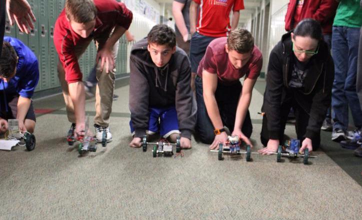 At noon on a Wednesday, twenty-five students crowded into the Applied Technology hallway of Glenbrook North, lining up against the lockers. They'd spent two weeks studying solar and hydrogen fuel cells and were poised to put their knowledge to the test. They spread out the five robot vehicles they'd built using different motor fuel sources, including battery, solar and hydrogen fuel, and hypothesized which would run the fastest or longest in a race down the hallway.
