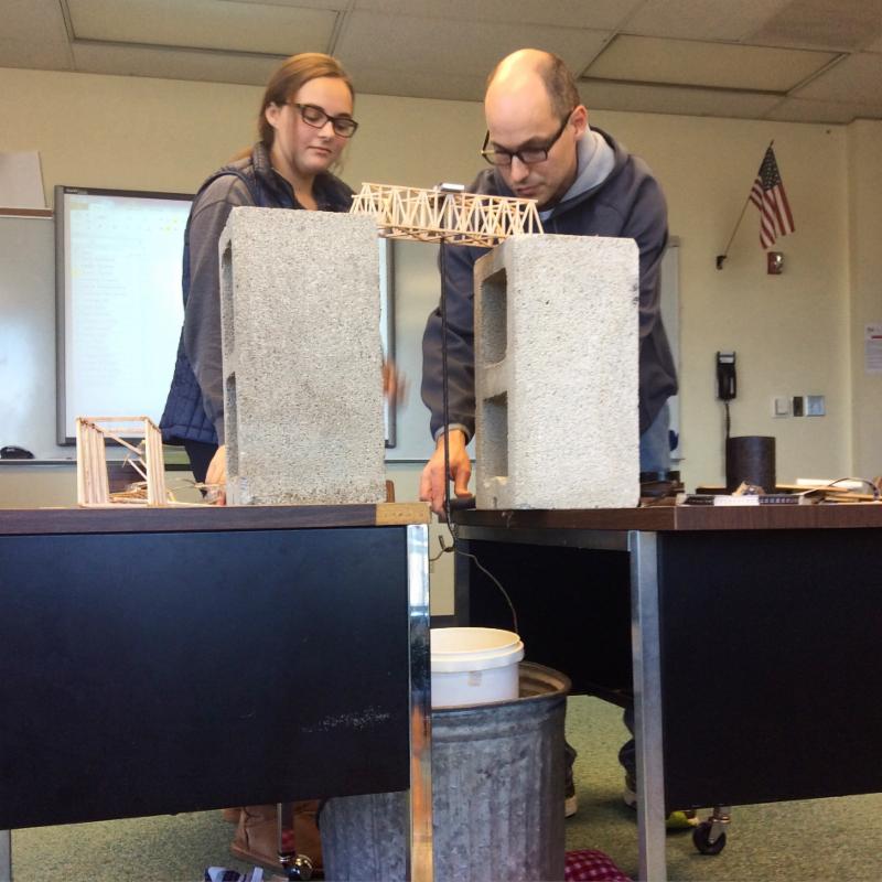 To offer a change from typical math with pencil and paper, Geometry students in Steve Goodman's class tackled a bridge building contest. Students who built a bridge that could support the highest amount of weight, while also weighing the least, would earn the prize.