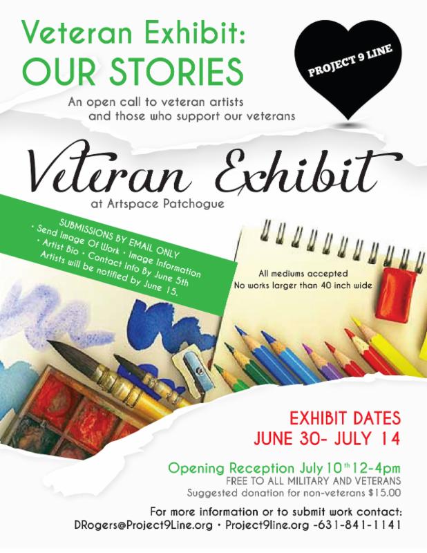 Open call for submissions from veteran artists and those whom support veterans. Project9Line's Veteran Exhibit: Our Stories will be on exhibit at Artspace Patchogue from June 30-July 14. There will be an artists reception on July 10 from noon-4:00 PM. The reception is free to military and veterans, $15 suggested donation for non-military. For more information call 631-841-1141 or email Rogers@Project9Line.org.
