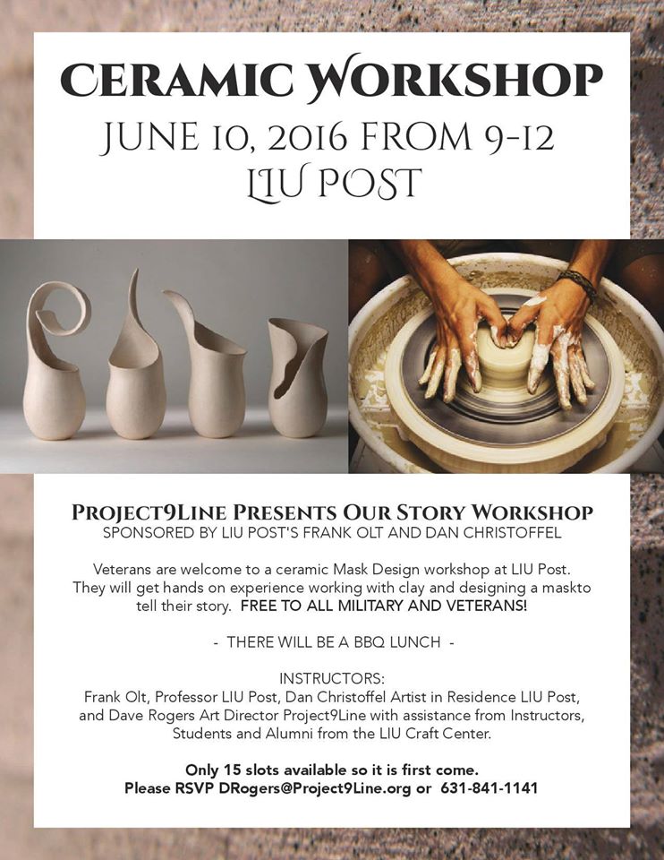 sponsored by LIU Post's Frank Olt and Dan Christoffel on June 10 from 9:00 AM - noon. Veterans are welcome to a ceramic mask workshop. Participants will get hands on experience working with clay and designing a mask to tell their story. The workshop is free to all military and veterans and includes a BBQ lunch. The workshop will be instructed by LIU Post Professor Frank Olt, LIU Post Artist in Residence Dan Christoffel, and Project9Line Art Director Dave Rogers. Students and alumni from the LIU Post Craft Center will assist. 15 slots are available, please RSVP: 631-841-1141 or Rogers@Project9Line.org.