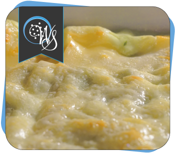 Preheat our oven to 350 degrees. Butter a shallow baking/casserole dish. Mince garlic. Heat cream with the milk, garlic, salt, pepper & nutmeg until right before it boils - add the minced garlic.