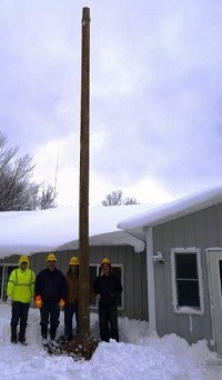 > Shown in the photo, from left, are the linemen who set the pole: Chris Murray, Chuck Skop, Bob Jones and Mike Streasick.